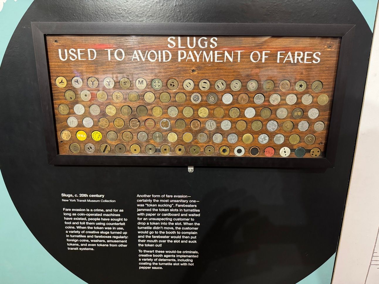 Check out this display of counterfeits! The description starts out with a bit of a scold, reminding us that fare evasion is a crime (to which I gave a deserved eye roll), but I have to imagine the museum is just covering the bases, because if they actually were humorless about such a petty non-offense, they probably wouldn’t have included this piece at all. One of my favorite things I learned on this trip was the practice of “token sucking” - a method of fare evasion where someone would jam the coin slot with paper or cardboard and wait for someone to unsuccessfully try to deposit a token. When the customer would go to the booth to alert the attendant, the farebreaker would suck the token out of the slot with their mouth. Nasty as hell, and if you’re willing to put your mouth on a subway turnstile to suck a coin, you should just get a free ride in my book! Not to bemoan our modern times too much, but these days people just hop turnstiles, there used to be a real art to fare evasion back in the day. I mean look at some of these slugs up close: